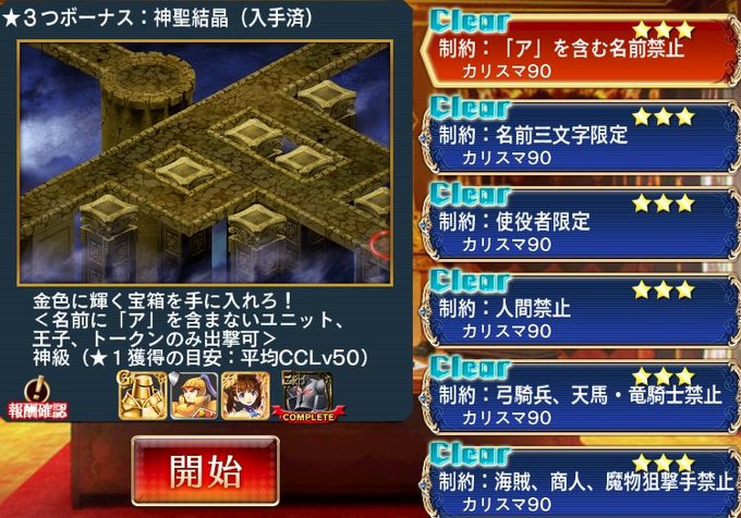 制約:「ン」を含む名前禁止-制約:呪術師、暗黒騎士禁止 制約:「ン」を含む名前禁止 制約:騎兵限定 制約:竜姫、竜巫女、竜兵禁止 Ⅶ 制約:魔術師、司祭、砲術士禁止 制約:ブロック2以下限定 制約:重装歩兵、射手、癒し手禁止 制約:「敵に攻撃し Ⅵ制約:「ト」「ラ」を含む名前禁止 神級 90 1800 ゴールド () 10 8 樽ビール 白金の聖霊 金の聖霊 極金の聖霊 15 39 制約:商人禁止 中級 30 600 ゴールド (3600) 10 8 花束 判定2回 妖精郷の射手ローレン15 魔水晶x2 アレグリア 10 35 制約:兵士、重装歩兵、射手禁止2 神級 90 1800 ゴールド ()
